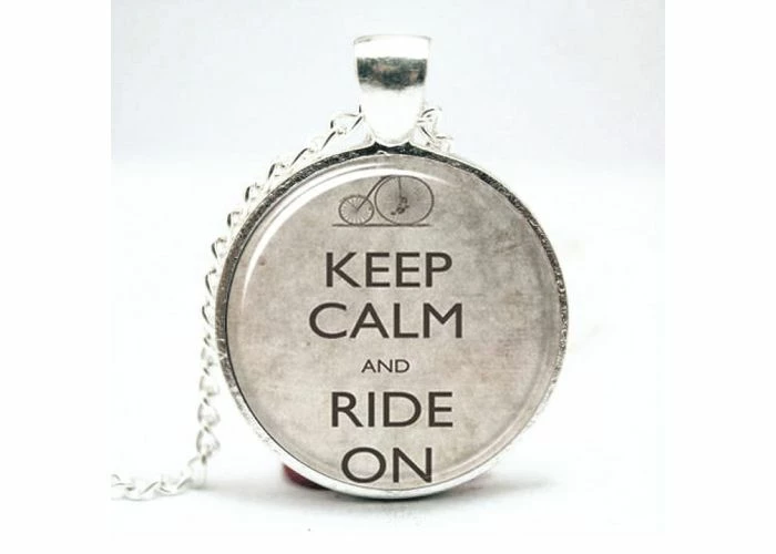 Our little Keep Calm and Ride On pendant & chain is an excellent accoutrement for the bike rider, the steampunk enthusiast, or just about anyone with a love and appreciation of retro motifs