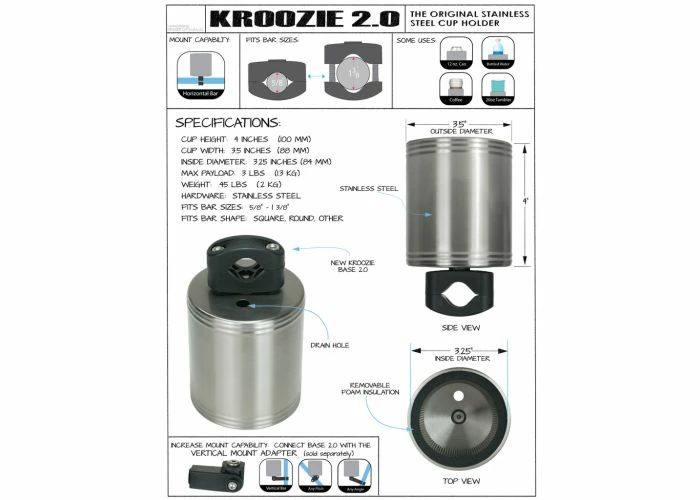 The 2.0 base fits bars as small as 5/8″ and expands to fit up to 1-3/8″, includes two 25 mm screws and two 30 mm screws. This is the clamp that comes with new Kroozie 2.0 and Kroozie Deluxe models.